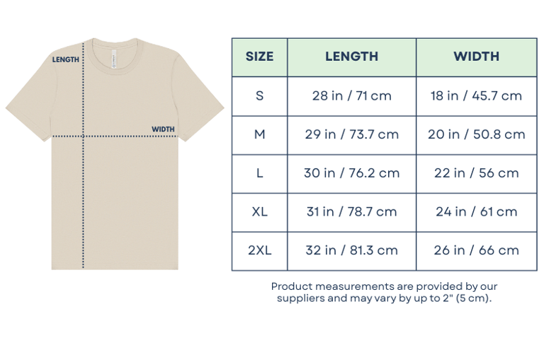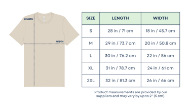Grab a tape measure and a T-shirt you already own and love. Lay it flat and measure it as shown in the chart(s) above.